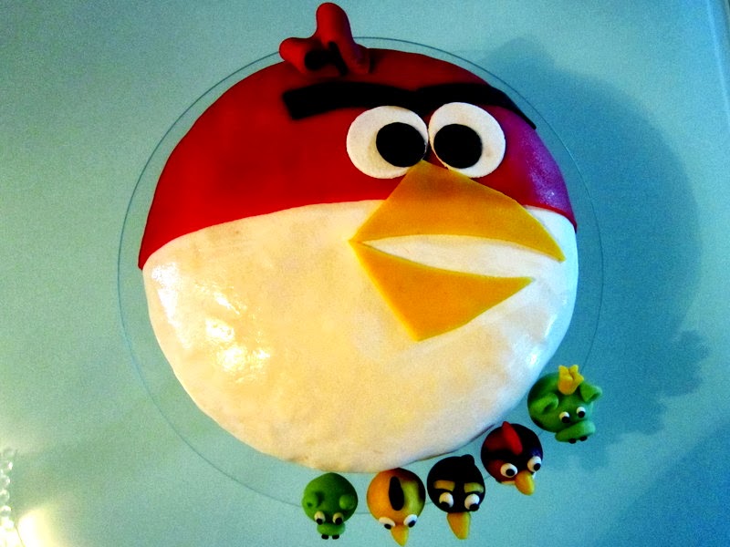 Tort składa się z biszkoptu, masy truskawkowej zrobionej z truskawek mrożonych i świeżych, masy maślanej, która jest niezbędna przy tortach obkładanych lukrem lub marcepanem, ponieważ masy z zawartością śmietany rozpuszczają zarówno lukier jak i marcepan, więc masło służy do izolacji masy truskawkowej od powleczenia tortu. Tort jest słodki ponieważ powleczony jest masą z pianek marshmallow i cukru pudru, ale truskawki swoją kwaskowatością równoważą smak. Małe angry birdsy i świnie zrobiłam z kolorowego marcepanu. smak tortu jest bardzo dobry...a efekt wizualny oceńcie sami :-)